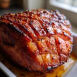 Close-up of a perfectly glazed ham with a beautiful, glossy brown crust and scoring.