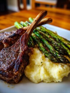 Lamskoteletjes met romige aardappelpuree en geroosterde asperges